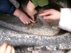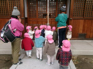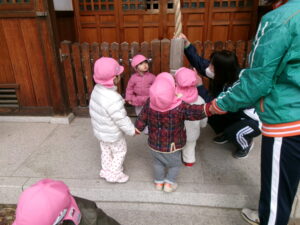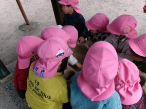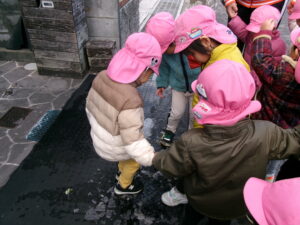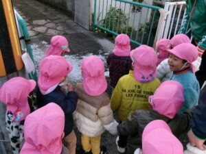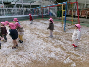 雪を見つけると「みーつけた!」を言いたくて^_^たくさん見つけましたよ!神社では氷ができてるかも?といつも水が張っているところを覗きに行って少しの水が凍ってて冷た〜い!と大喜びでした。こんな寒い日も楽しめる丈夫な子どもたちでした。