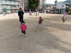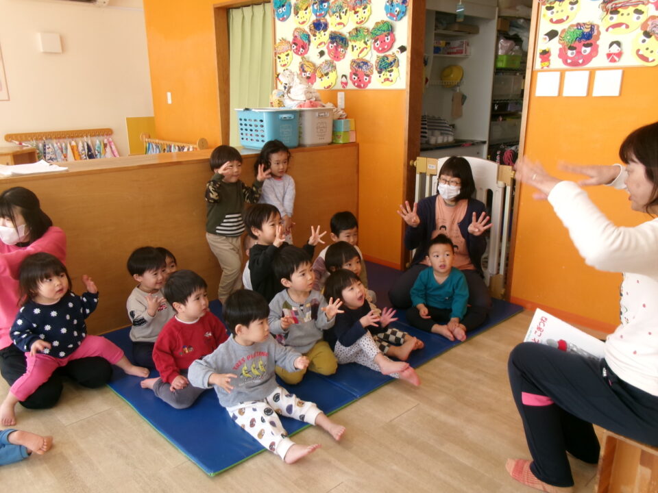 子どもたちは、おおかみの声をよく聞いていてワクワクしながら一歩ずつ近づいて来て…「3時!」と聞くとキャ〜〜と走って逃げていました。