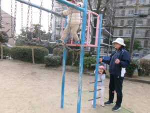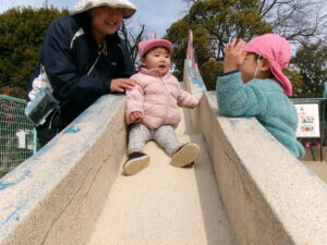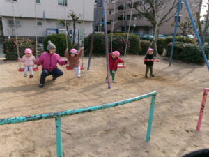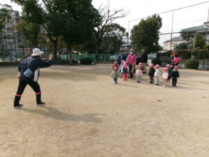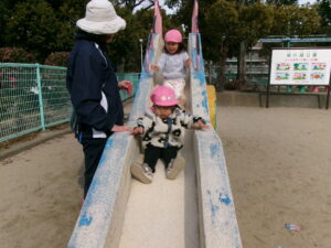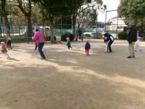 今日は、少し気温も上がり風もなく過ごしやすいお天気になったので、元気にお外で遊ぼうね〜とお話し、子どもたちも張り切って準備をして公園へ出発です!