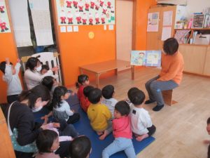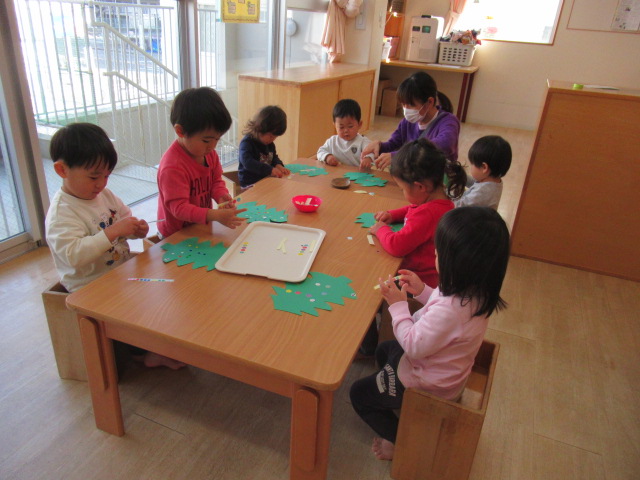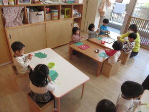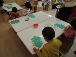 シール貼りをしてクリスマスツリーの形に切った色画用紙を飾り付けました。大きいマルや小さいマル、いろんな色、柄のシールを自由に貼りました。裏も表も楽しんで貼ったお友だちもいます。ぜひおうちで星や飾りなどを描いたりして、お子さんと一緒に楽しんでくださいね。お部屋に飾るととても喜んでいた子どもたちです。「サンタさん来るかなー」とクリスマスの歌をうたったり、おはなしを読んだりして楽しみにしています。