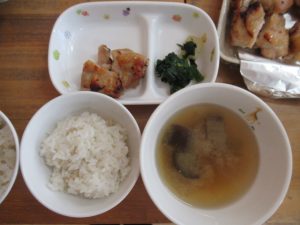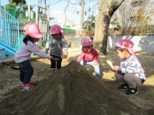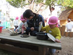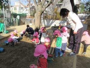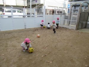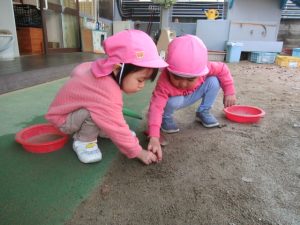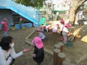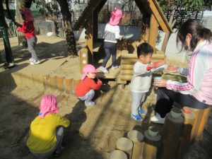 シール貼りをした後は園庭で遊びました。園庭に落ちているどんぐりを探して集めたり、葉っぱでお料理をしたり、ボールで遊んだり…日なたで背中がポカポカ、気持ちよく外遊びの時間が過ごせました。