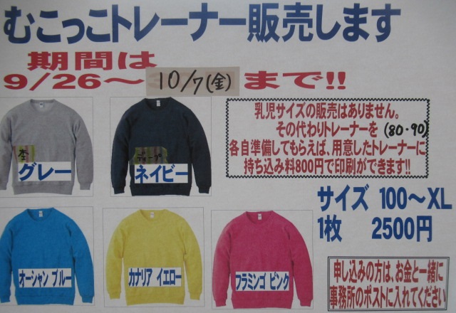 ※むこっこトレーナーの申し込みは7日が締め切りとなっています。申込みはお電話でも受け付けますので、よろしくお願いします。 ↑今年のイラストです。毎年むこっこと北の年長さんが描いています。