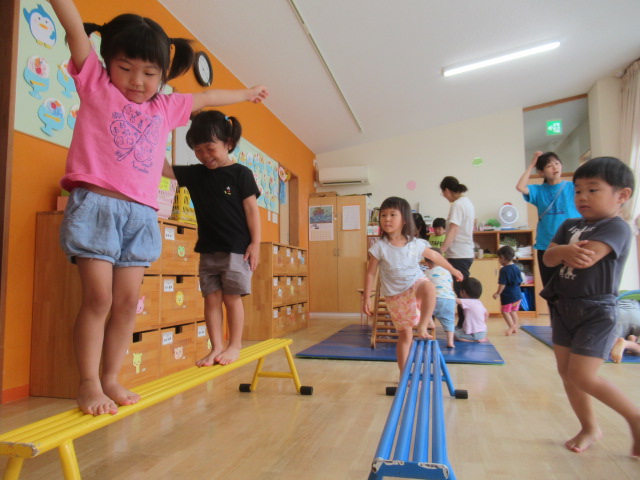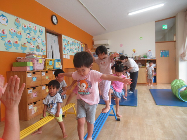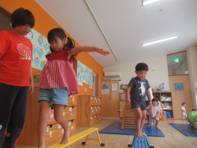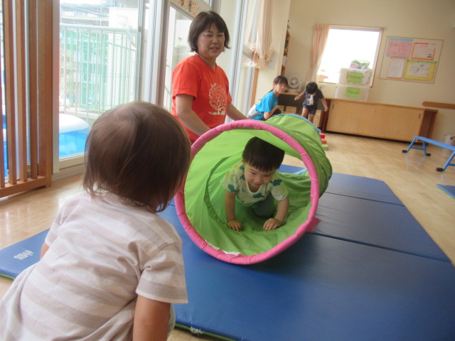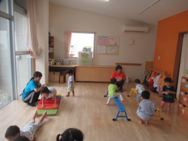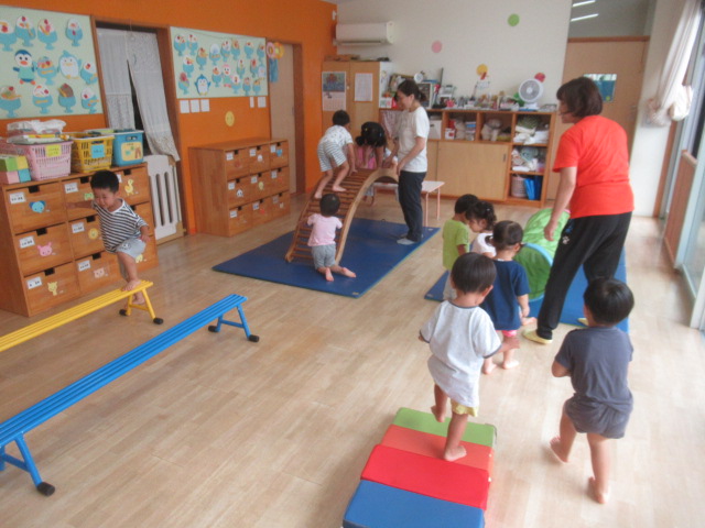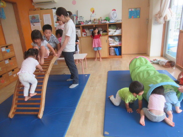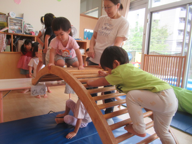 お部屋に大きな遊具を出して遊びました。いろんなタイプの遊具を出したので何度も何度も遊びました。太鼓橋は最初は怖いと言っていたお友だちも何度かやるうちに自信がついたようで楽しんでいました。