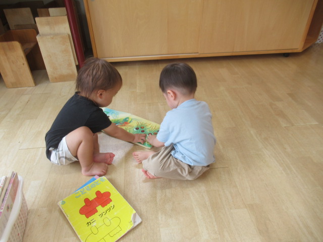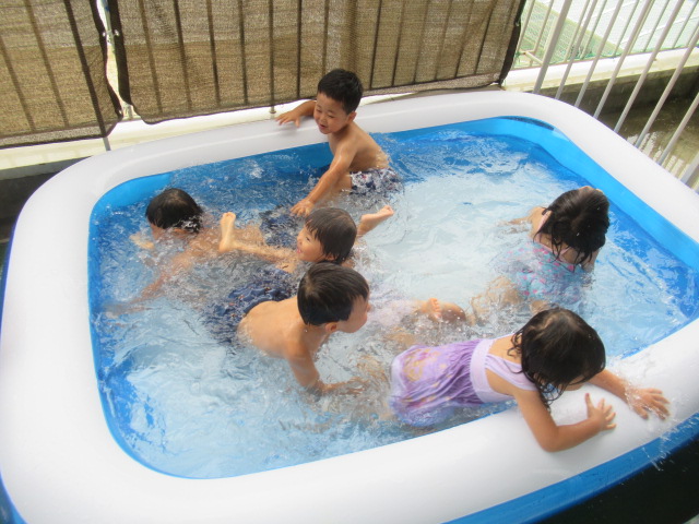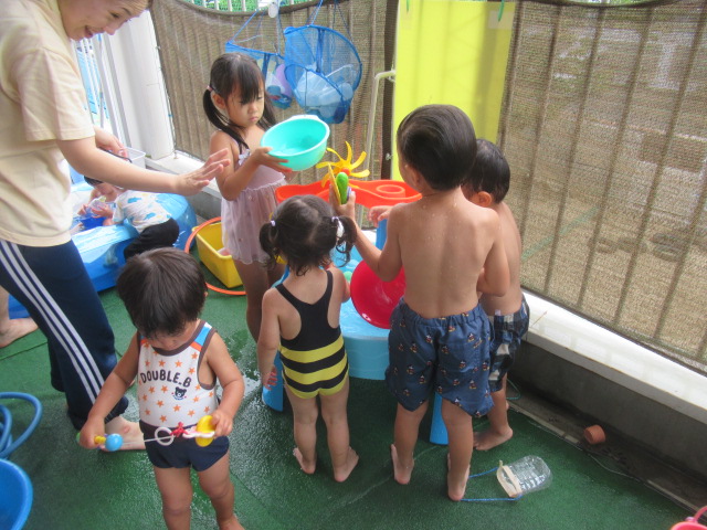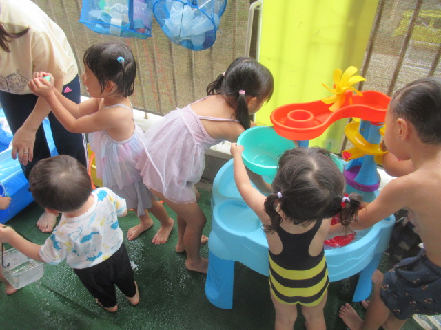 まだまだ暑いのでお水に入るとみんなにっこりいい表情になります。みんなでかえるになったりバタ足したり、みんなでやるとより一層楽しくなるようです。水遊びコーナーは新しいおもちゃが人気です。