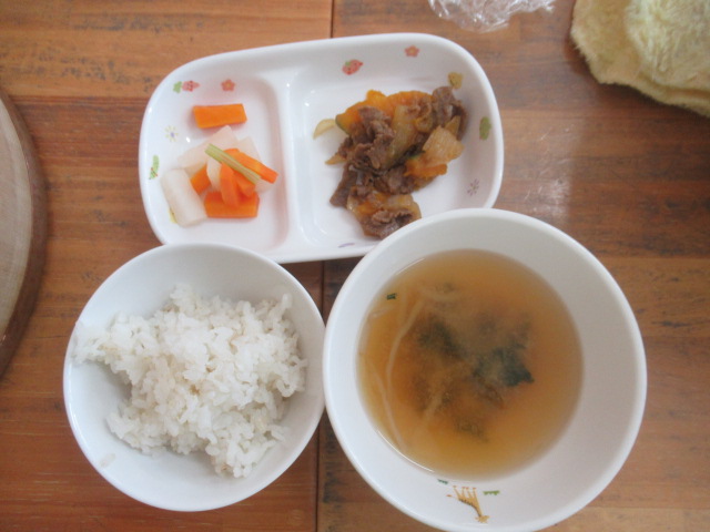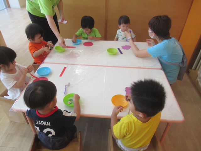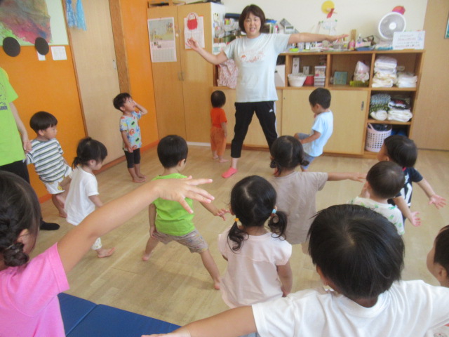 朝のお集まりではお名前を呼ばれたらお返事「はい」、新しいお友だちもみんなの真似っこして元気にお返事してくれましたよ^_^元気いっぱいの子どもたちとだるまさんが…のペープサートをしました。だるまさんが、ビロ〜ンと伸びる場面ではつま先立ちで誰よりも高く手を上げて高い高〜い。