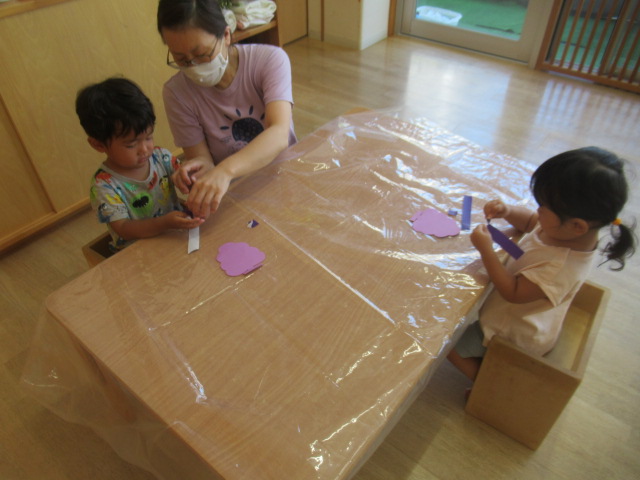 子どもたちが、好きな果物を選び色紙を手でちぎり糊で貼ります。出来上がった果物は列車に乗って出発進行!早速、壁面に貼ってもらってとっても嬉しそうでしたよ♪