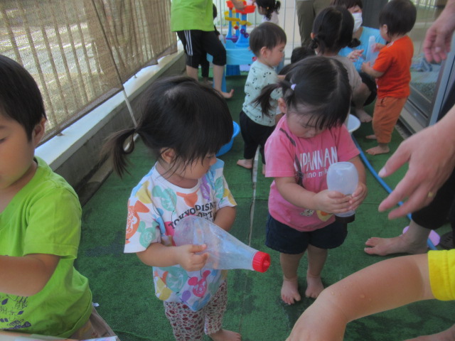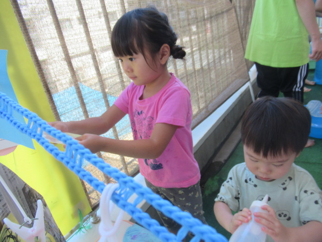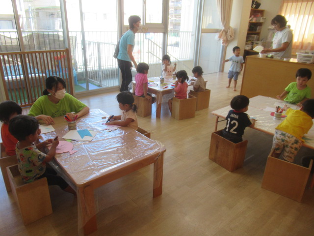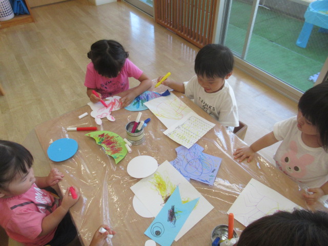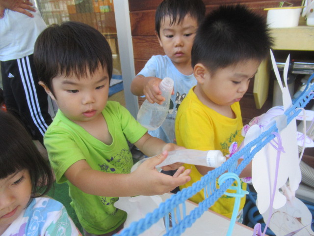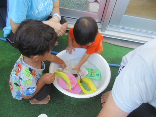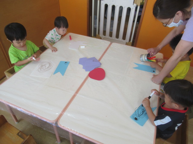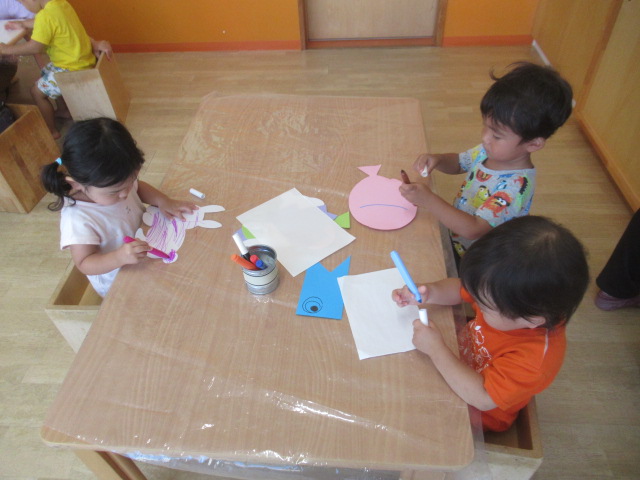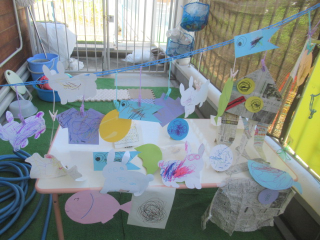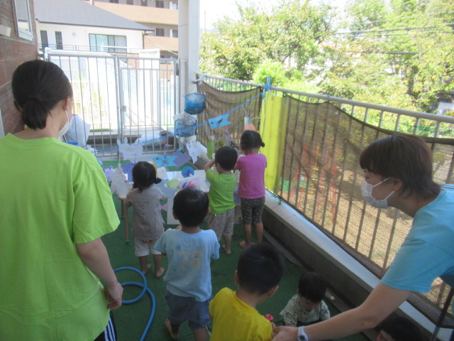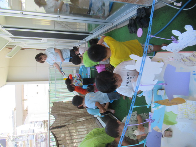 子どもたちに色々な形をした紙に好きな絵を描いてもらって水遊びに使う的を作りました。「カニさん描いたよ〜」や「お化けだぞ〜」とたくさん描いた的をお水で狙って…「当たった〜!」当たると水性ペンで描いた絵が滲んで混ざり合う様子も楽しみながら遊びました。