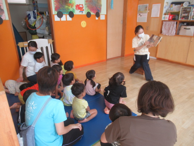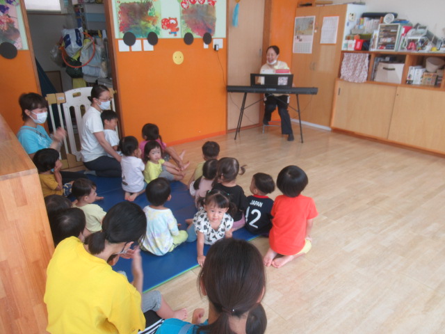 「どんぐりころちゃん」の絵本を見ました。どんぐりが木からポーンと飛び出し落ち葉の中でみんなのことを待っています。もう少し涼しくなったら公園でどんぐり探そうね!楽しみが1つ増えた子どもたちです😊