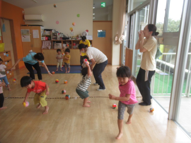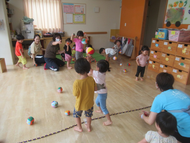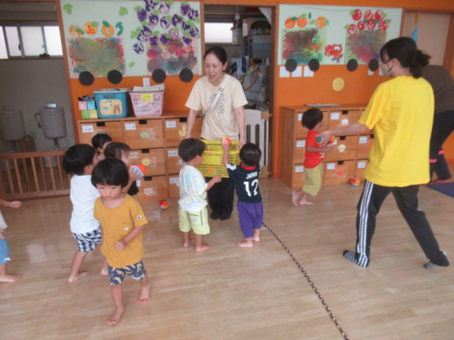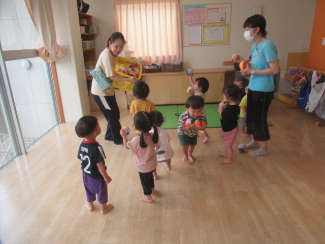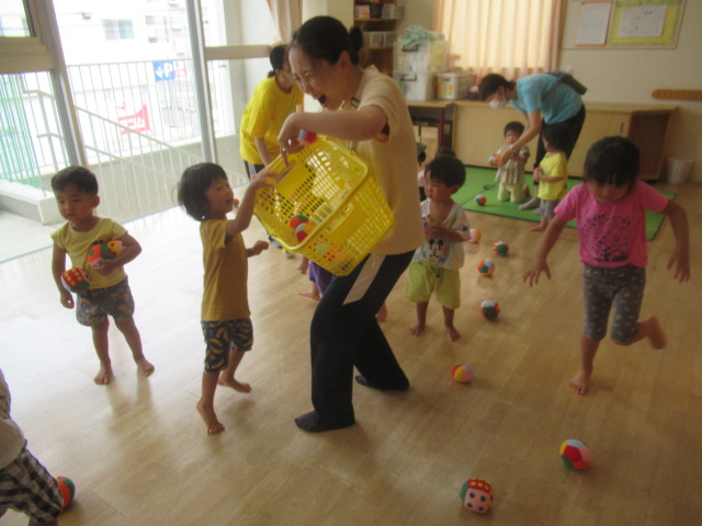 玉入れと投げ合い競争をして遊びました。まずは玉入れです。カゴを持って逃げる保育士を追いかけてボールを投げ入れました。中々届かなかったり入らなかったりしますが、そんな時は保育士に手伝ってもらい、入ると「やったー!😄」と、とびきりの笑顔になりましたよ!次は投げ合い競争です。2つのチームに分かれてボールを投げ合います。どちらが相手チームにたくさんボールを投げることができるかな?みんな投げたり転がしたり、中には座ったまま投げているお友だちもいて、色々な姿が見られました。最後は片付け競争です!これが1番上手に出来ていましたよ😊