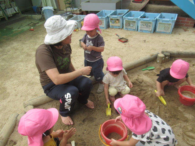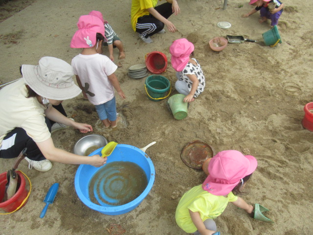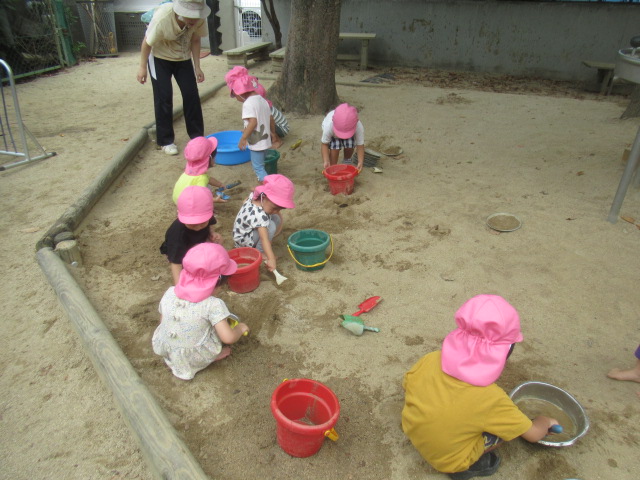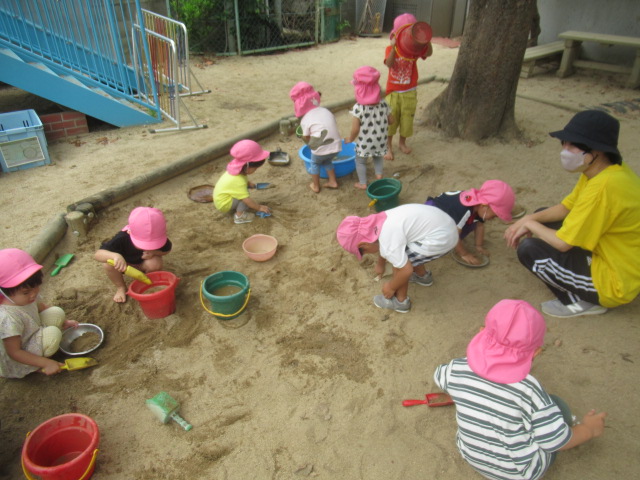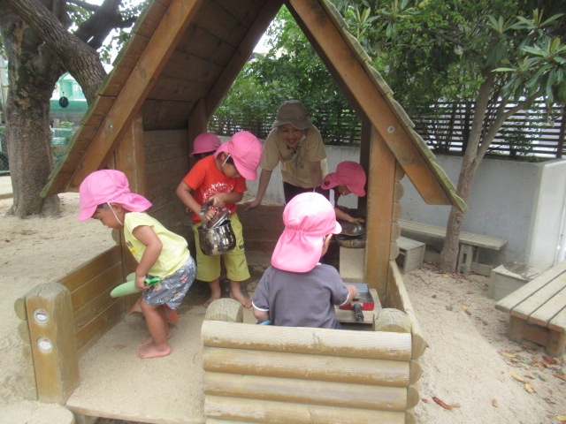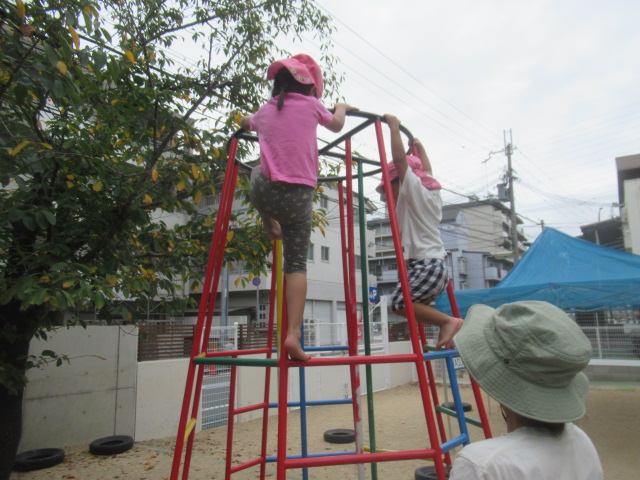 砂場で水たまりを作って足を入れて水の感触を楽しんだり、八角ジムでどこまで登れるか挑戦したり、時間いっぱい外遊びを楽しみました。最後にシャワーで汗を流してサッパリしてから給食を食べました。