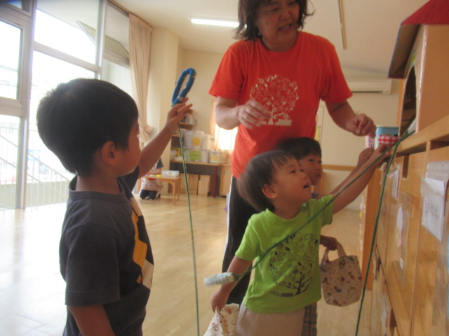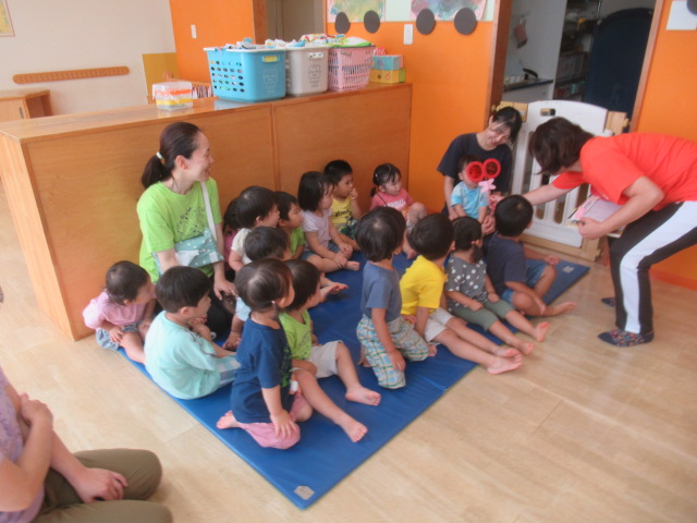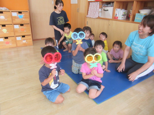 まだまだ暑い日が続きますが、空は高く秋の雲も見られる様になりましたね。お集まりで♪トンボのメガネを歌いました。どんぐりのみんなもトンボの気分になって青色、ピカピカ(黄色)、赤色メガネをのぞいてみましたよ。周りの景色が違って見えたので喜んでいました。