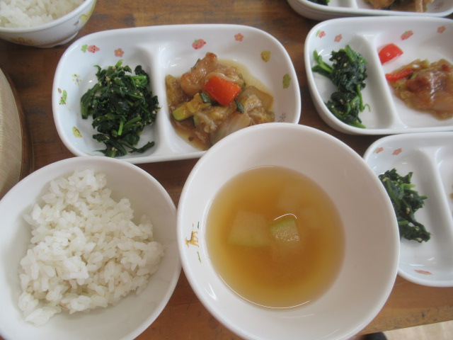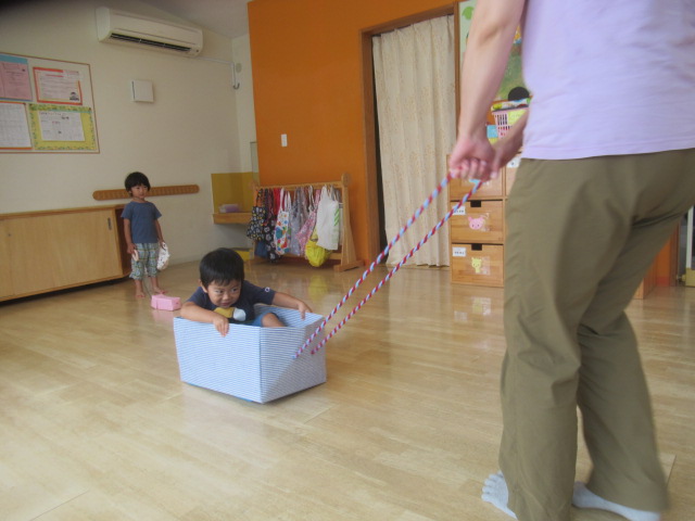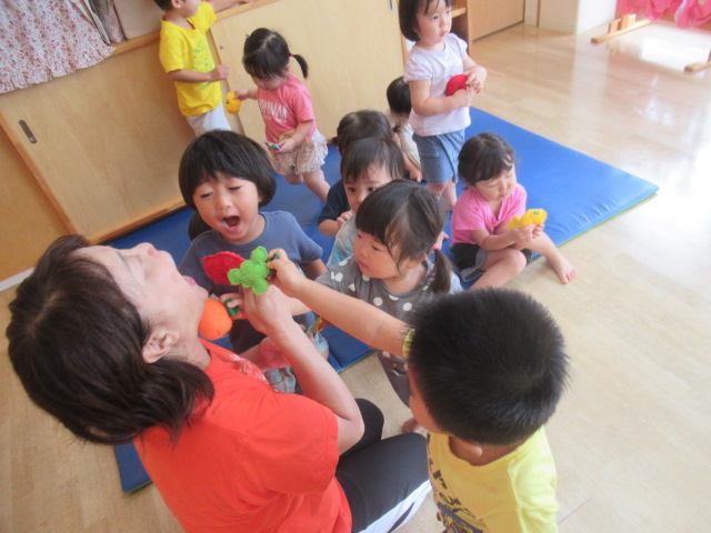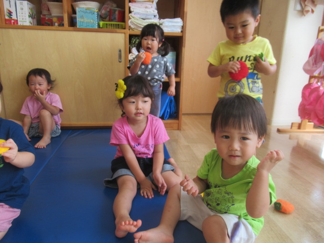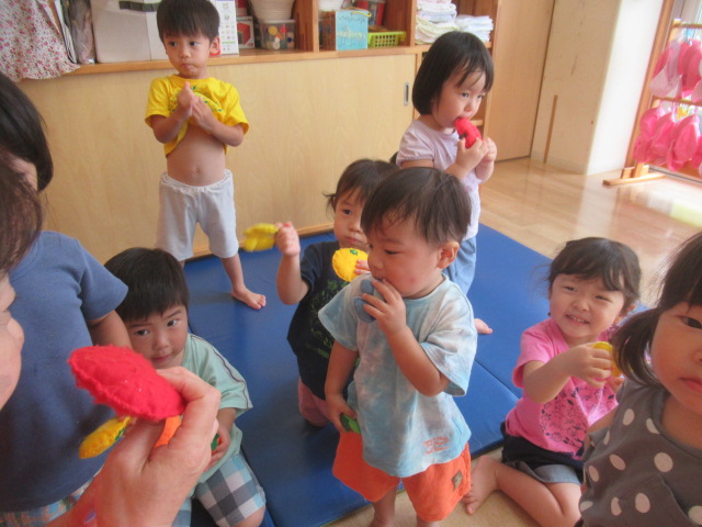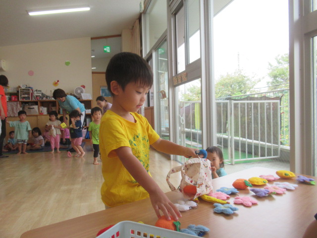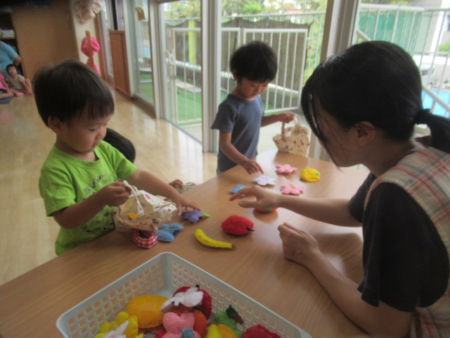絵本『こんた、バスでおつかい』を読みました。みんなでおつかいごっこをしてみましたよ。子どもたちが良く遊んでいる(紙パックの)動物たちとお散歩しながら柿やみかんなどの果物を買い、帰りはバスで帰って来てねとお願いしました。「行って来ま〜す」と元気良く出発し、帰りのバスでは動物たちを抱き抱えて嬉しそうに帰って来ましたよ。買った果物をみんなで食べました。「食べて、食べて〜」と保育士にも分けてくれる優しい子どもたちでした♪