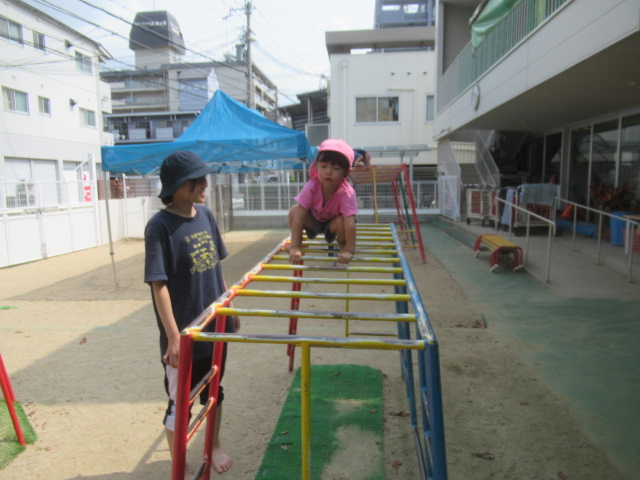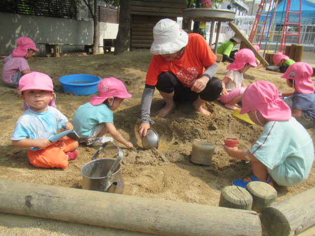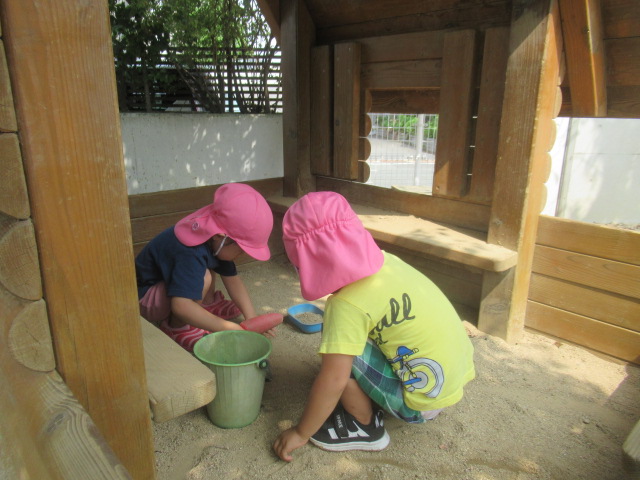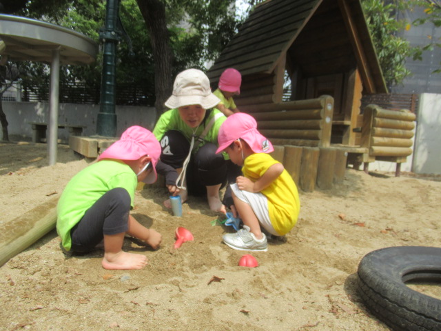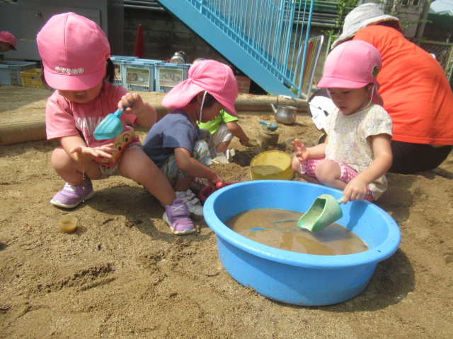お砂場に水を撒いていると水のトンネルを潜り抜けようと子どもたちは嬉しそうに集まって来ました。タライにお水を入れて、まだまだ水遊びを楽しんでいます。泥んこになって遊んだ後はシャワーを浴びてスッキリしました。