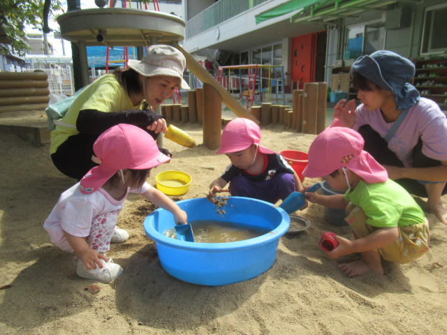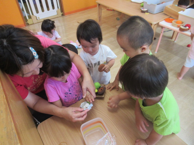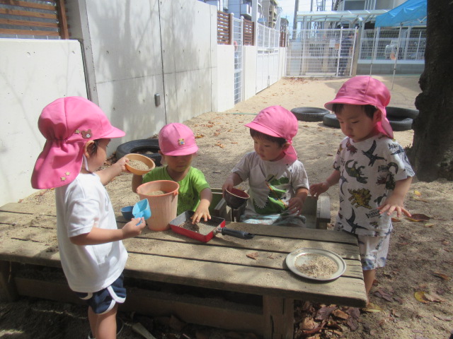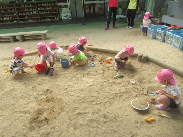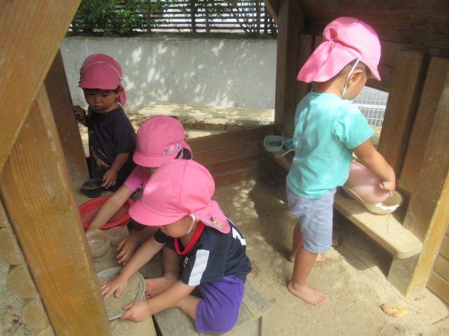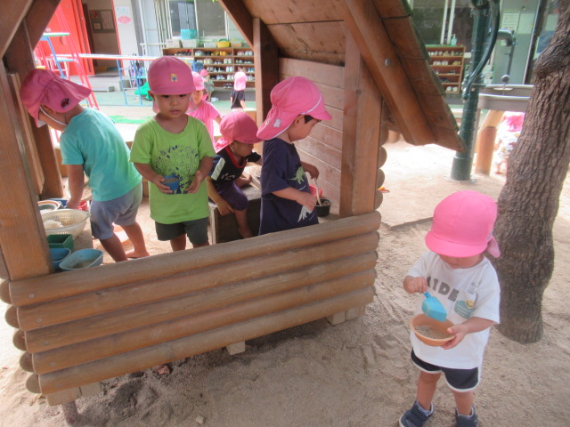 園庭では雲梯、八角ジム、木の家、砂場などでお店屋さんごっこやおうちごっこなどたくさんお料理を作って遊んでいましたよ。遊具の貸し借りではもめることもありこんな時は「貸して」って聞いてみるといいよ。とお友だちに聞きに行ってみたりする姿もみられましたよ。