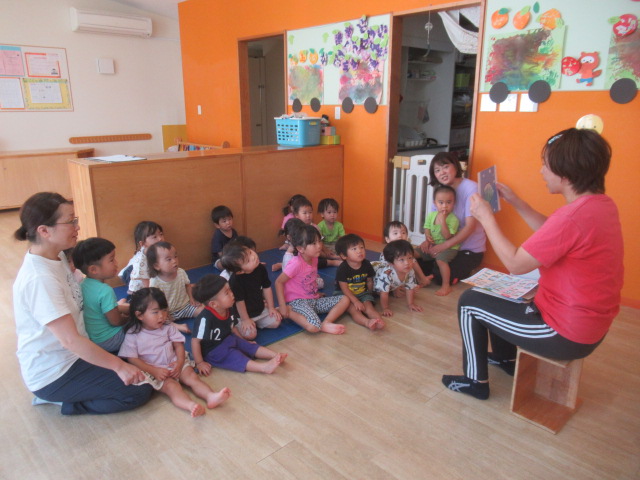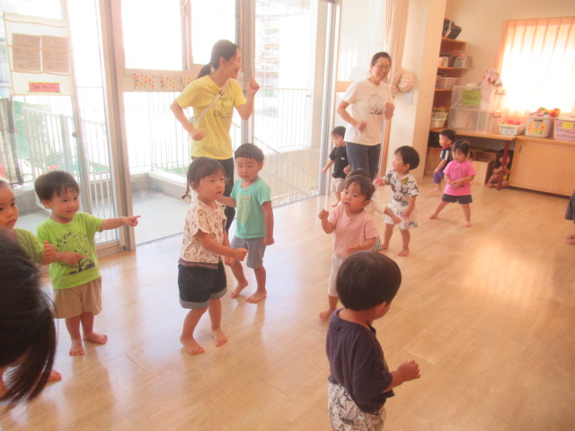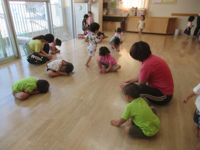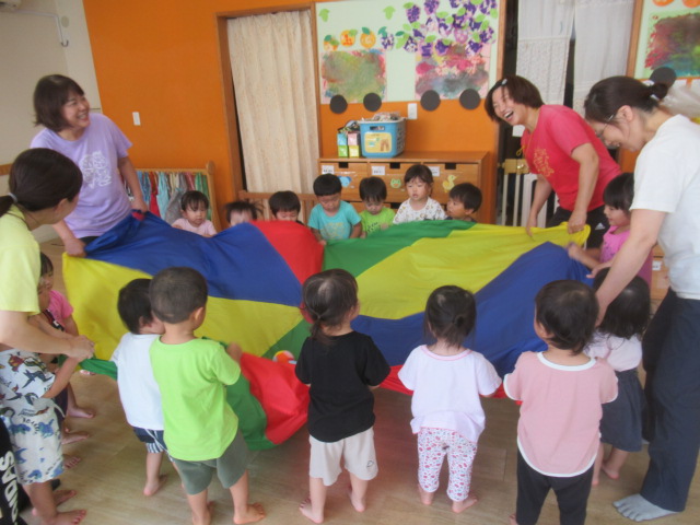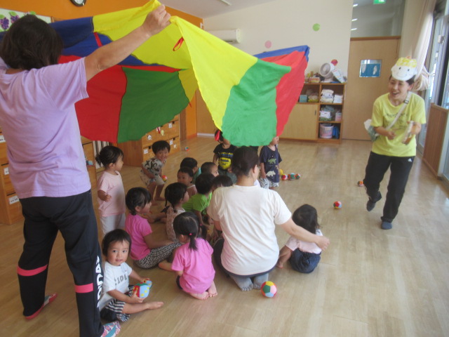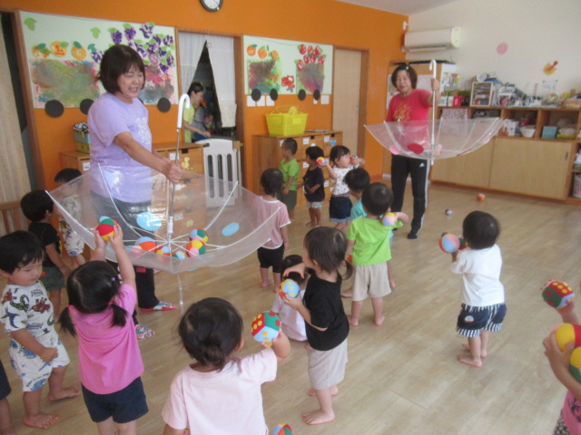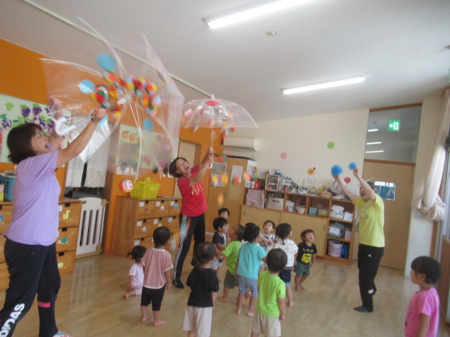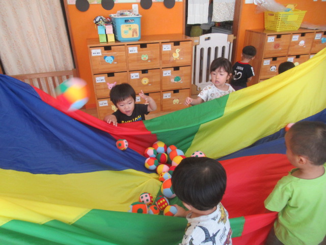 今日も、ジャングル体操をしてから玉入れ遊びをしました。玉入れの途中にまたいたずら「風の神様」や「かみなり様」がやってくるかもしれないね。遊びにきて玉が落ちたらまた頑張ることできる?「うん!だいじょうぶ!」とお話をしてからスタート!あともう少しで全部入りそうなタイミングで「風をふかせるぞ~!」とグルグル回ってせっかく入れた玉も風で吹き飛ばされました。よし!もう一度がんばるぞ~!と遊んでいると今度はかみなり様がやってきました。「ドンドン♪ゴロゴロ♪」と愉快に踊りながらやってきました。みんなは屋根を探してパラバルーンの中に隠れました。お騒がせかみなり様は愉快に踊りながら帰っていきました。最後は大きなパラバルーンに玉入れをして楽しみました。