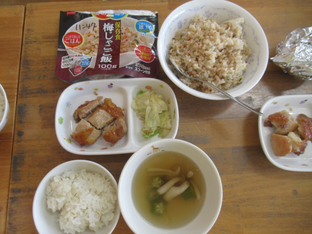災害の時、ご飯が作れなくなった時、家ではなくて避難先で過ごすことになった時こんな風に過ごすんだろうな。こんな感じになるのかな?と少しでもイメージができるような給食メニューでした。大人は紙皿に入れて食べました。子どもたちはいつもどおりでしたが、本当に災害となった時は子どもたちも同じ状況で食べることになるかと思うので、もう一度家での備えを確認していただけるきっかけになればと思います。