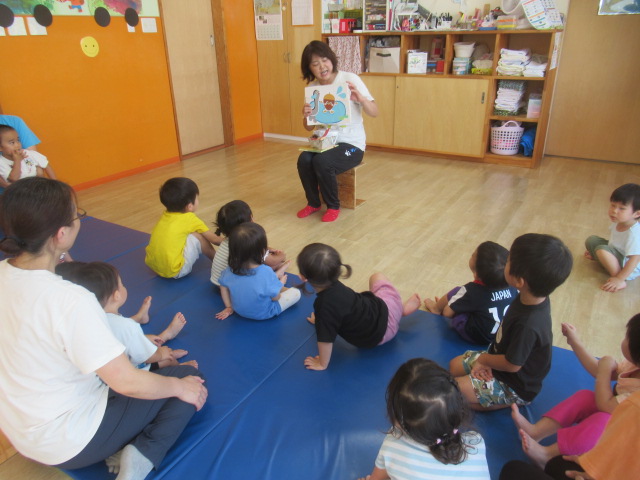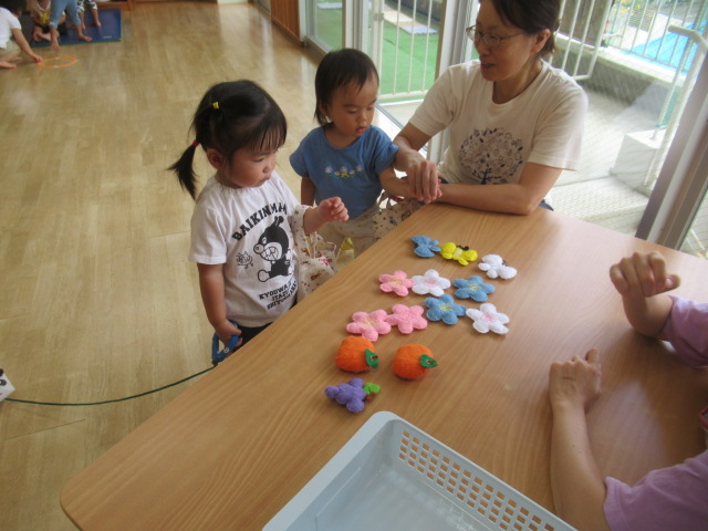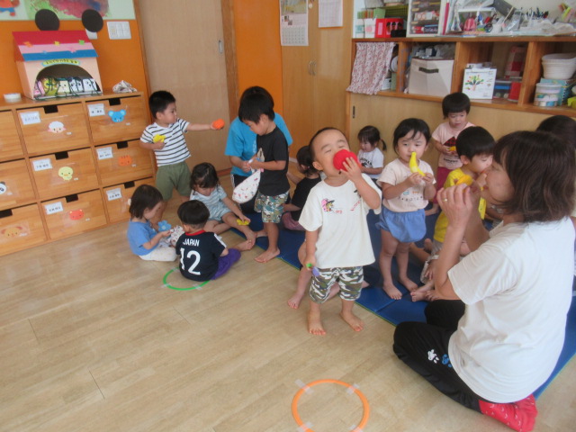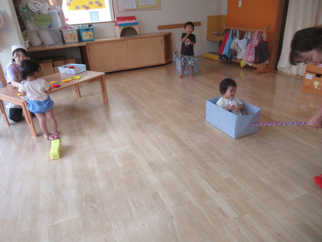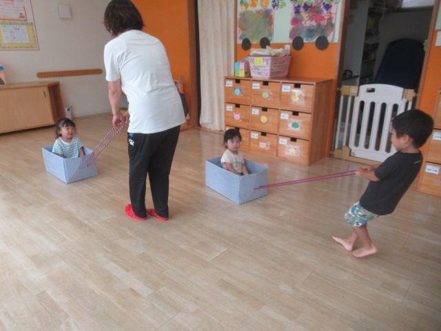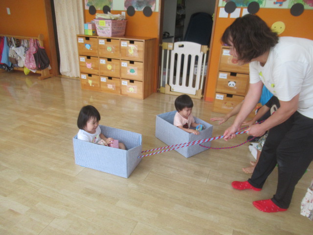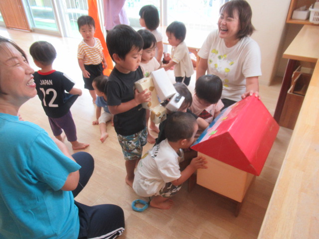 子どもたちが良く遊んでいる(紙パック)の動物を連れてお散歩をしながらお買い物をしてバスに乗って帰って来る遊びをしました。お店では、どれにしようかな?とあれこれ迷ってお買い物している姿が可愛かったです。帰りのバスも動物を抱いて嬉しそうに乗り「ただいま〜」と元気に帰ってきましたよ。みんなが買って来た果物をピクニックしながら「何、買って来たの?」と楽しくお話して食べました。一緒にお買い物へ行ってくれた動物たちも優しくみんなで運んでお家まで送ってあげました。