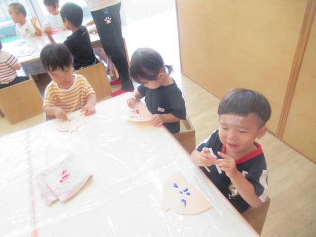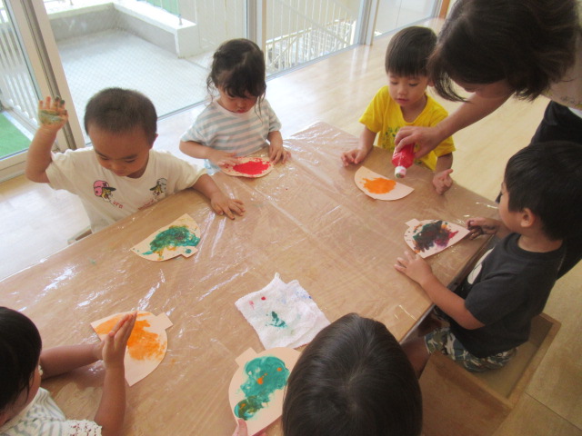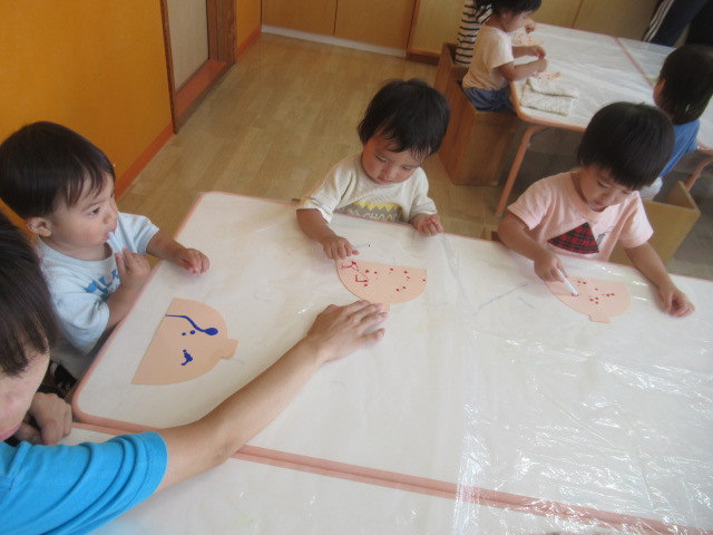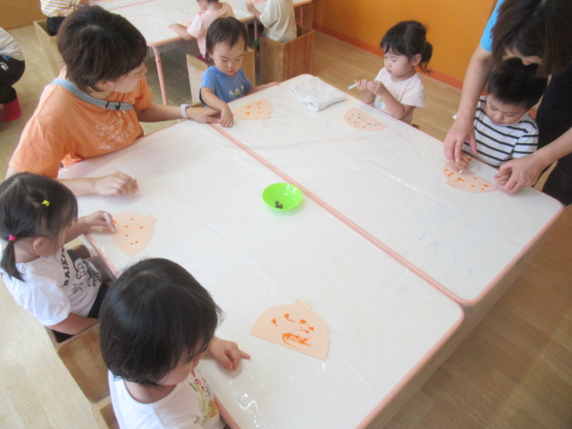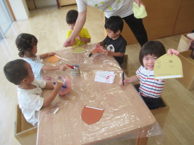 10月の壁面制作は子どもたちが大好きな♪どんぐりころちゃんの歌に出てくるころちゃんのステキな帽子を作る事にしました。帽子型の画用紙に好きな色の絵の具を垂らして、フゥ〜と吹くと絵の具が弾いて広がる様子や色が混じり合う様子を見てもらいました。やってみると「ふーっ」と吹くのが難しい子がたくさんいたので、吹くだけではなくストローを使って吹いてみたり、指で伸ばして描いてみたりしてステキな帽子が出来上がりましたよ^_^