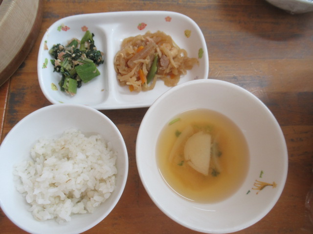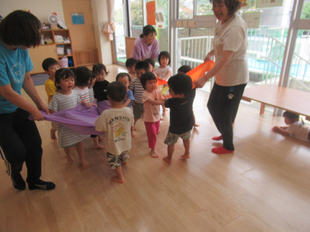 朝のお集まりで「昨日、公園にどんぐりを拾いに行ったらね…」と子どもたちに話をすると「どんぐり拾い、行ったよ」とどこの公園にあった♪など楽しくお話も弾みました。そして、公園で拾ってきた松ぼっくりやどんぐりを見ながら秋の歌をたくさん歌いました。子どもたちは手で振り付けをしながら知っている歌が出てくると嬉しそうに歌っていましたよ。