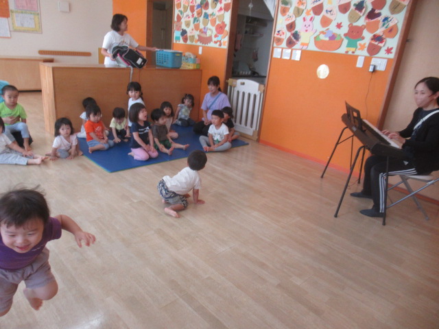 「どんぐりころころ」「カエルのうた」を歌いました。カエルのうたは子どものリクエストです😊お父さんカエルになったり、子どもカエルになりきってジャンプ!したり、元気なカエルがいっぱいです😊