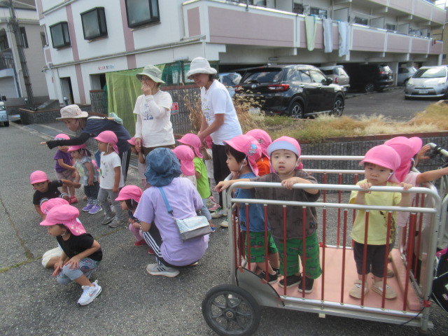 朝のお集まりで「どんぐりころころ」の絵本を見て、どんぐりにはたくさんの種類があって、色んな形があることを知りました。それから、どんなどんぐりがあるかな?たくさん落ちてるかな?と、探しに行きました。守部神社の近くにどんぐりの木があり見に行くと、少しだけ木に成っているのを見つけました!でも、まだ緑色のどんぐりばかり。下にはあるかな?と探していると、古いどんぐりを見つけました。「次来る時は茶色く大きなどんぐりに育ってるかな?また来ようね😊」と次に来る時の楽しみをとっておくことにしました。
