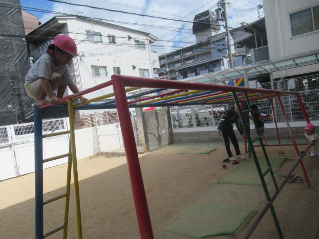 散歩から帰って、園庭で遊びました。今、うんていが人気で登ってぶら下がったり、少し怖い子どもは登るだけを楽しんだりしています。
