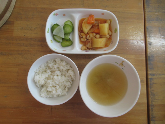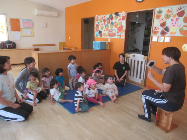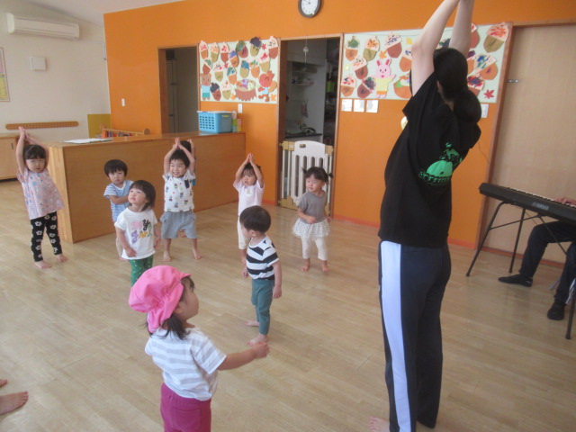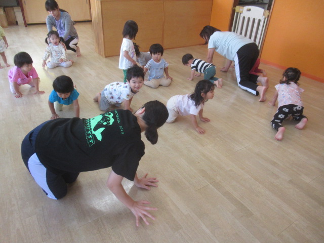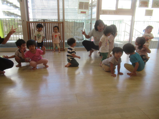 今日はお集まりの後、うさぎ(両足跳び)やハイハイの四つ這い、カメ(足首を持って反り返り顔をグンと上に向ける)、とんぼ(両手を広げて友だちとぶつからない様に走る)などなどいろんな曲に合わせて身体を動かしました。出来るか出来ないか考え中のお友だちは、窓際でみんなの姿をじーーっくり見ていましたよ^_^