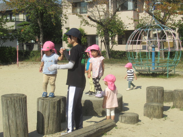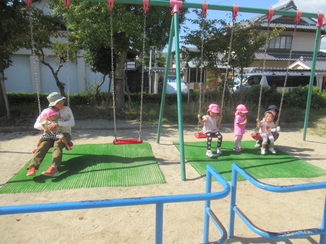 公園では好きな所でめいいっぱい遊んで来ました!滑り台に走って行ったお友だちが多くてびっくり!お部屋では見ない姿が公園ではたくさん見られました!ブランコ、砂場、木の丸太登りなどなどどれも大人気!でいーっぱい遊んで来ました!外遊びが楽しい季節となってきたので散歩等で子どもたちの指差す先の知りたい事、「コレなーに?」に付き合うにはベストな季節です♪忙しい合間にちょっとしたホッコリタイムいかがでしょう?^_^