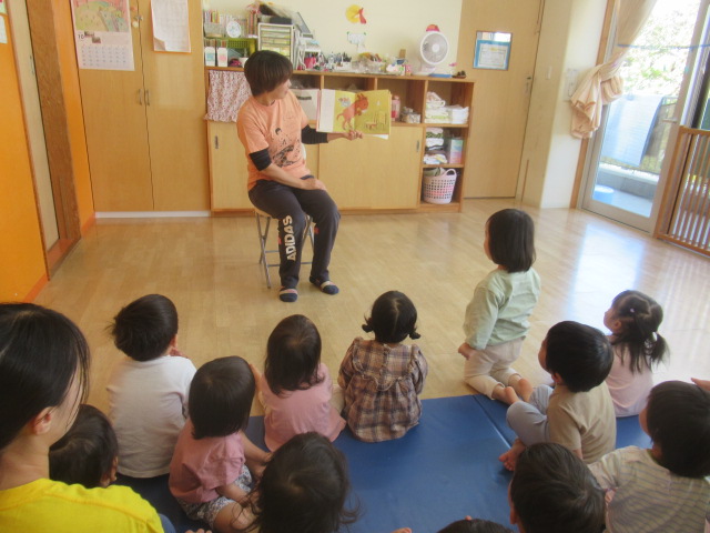 ロバが拾ってきたどんぐりを「どうぞのいす」の上に置いて、寝てしまっている間にいろんな動物がやってきて物々交換のように変わっていく話です。そんな話を読んで、みんなもロバさんみたいにたくさんどんぐり拾いに行こう!と誘うと「行こう!行こう!」とノリノリ!