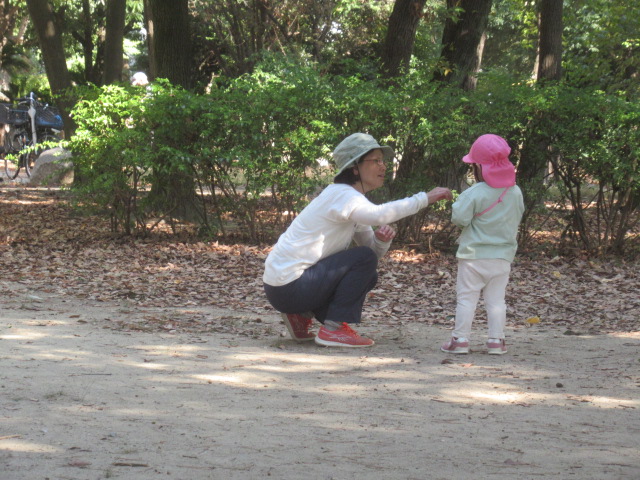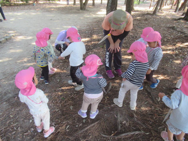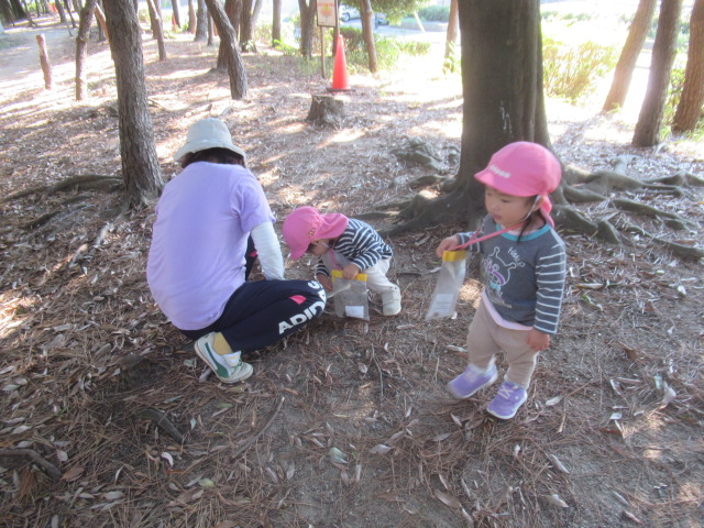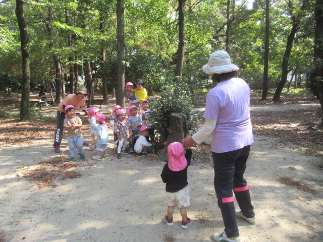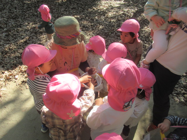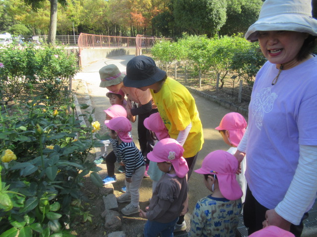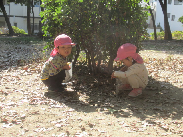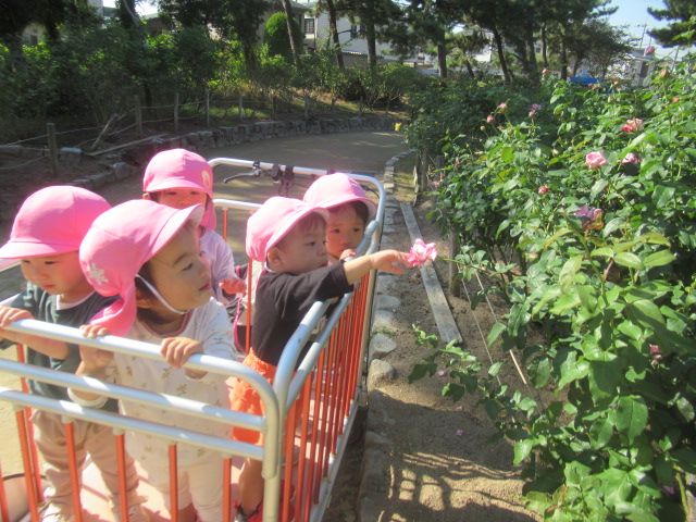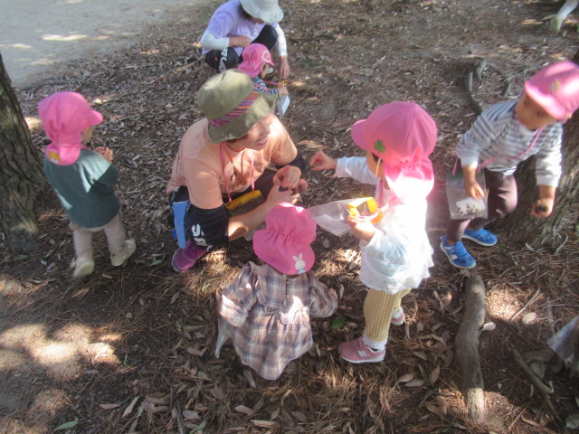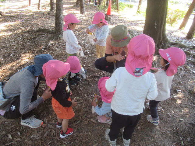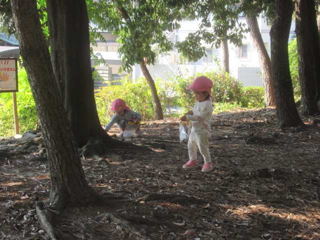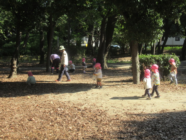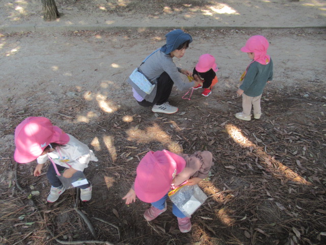今日は大井戸公園まで行ってきました!公園に着くと綺麗なバラがチラホラ。花を見つけるとすぐにクンクンと匂いを嗅いで「うわー💦」と苦手だったという子と「良い匂いー」に分かれましたが、とっても良い香りがしました^_^綺麗なバラを見ながら公園の森の方へ向かい、どんぐり探し!葉っぱをめくりながら探す子、葉っぱの中が気になってそれは先生がやって💦と目で訴える子、どんぐりよりも葉っぱや木の実が良い!たくさん集めていたり、どんぐりの実はとーっても小さかったですが、たくさん見つけられたのでたーっぷり遊んで帰ってきました^_^集めた木の実から一つ、ロバさんのお皿にお裾分けしてあげよう!と声をかけるとみんなたくさん入れてくれるので、みんなのがなくなるからそれぐらいで十分だよ!ありがとう!と止めたぐらい^_^優しいどんぐりルームの子どもたちでした。帰り道もおしゃべりしながら楽しく帰ってきました。