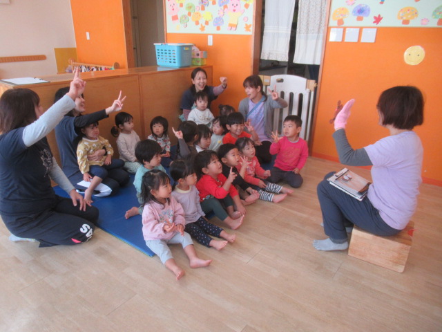 うたに合わせて手遊びをして、最後にジャンケンをします。じゃんけんがまだわからなくても楽しめるようで、今朝はみんなでうたって、じゃんけんをして楽しみました。