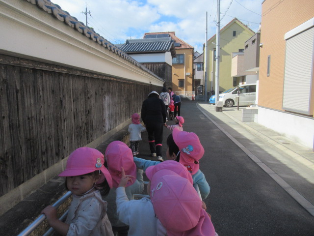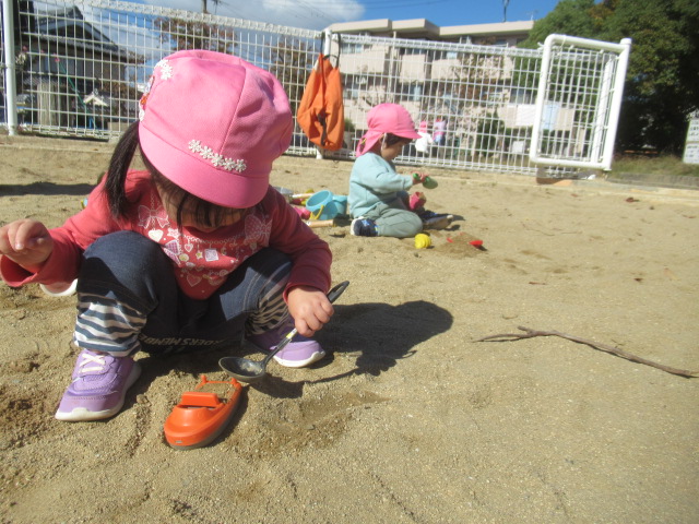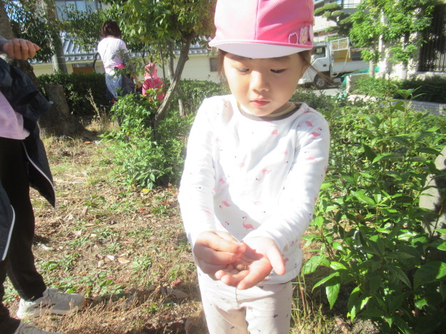 気温が下がり、服装の調節が難しいですね。子どもたちと散歩に出るため、トレーナーに着替えて少し暖かくしてでかけました。トレーナー代わりに、薄手の長袖を2枚重ねたお友だちもいます。公園に着くと陽が当たって暖かでした。どんぐりを拾ったものを見せあいっこしたり、遊具で遊んだりしました。