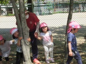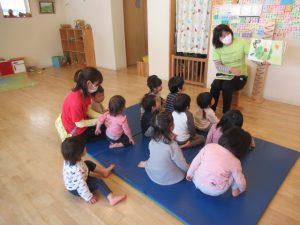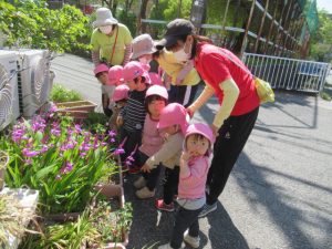 朝のお集まりで《まっかになあれ》の絵本を読みました。畑に一粒だけ青い苺がお日様の光を浴びて真っ赤な苺🍓になるお話です。絵本を読んでいると「苺のお花って何色やっけ?」と聞いてきたお友だちがいました。他の子どもたちもわからない様子。「ほら、いつもお散歩の途中で見せて貰っているお家の苺のお花、何色やったかな〜?」と場所を言うと「あっ!白い色や〜」と子どもたち。目の前に無い物でも想像して思い出す事が出来ました。「本当に白い色してるか見に行こうか!」と誘って早速、苺を見にお散歩へ行きました♪