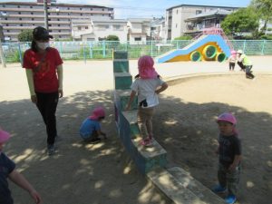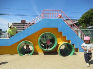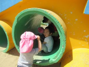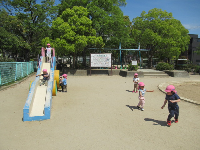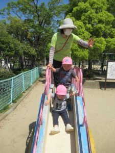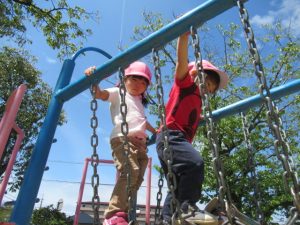 公園では、滑り台や吊り橋で遊んだり保育士やお友だちとかくれんぼをして楽しみました。青い空に真っ白な飛行機雲✈️を見つけ喜んだり蝶々を追いかけて走り回っているお友だちもいましたよ。