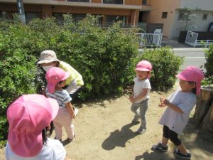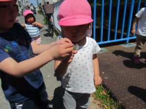 お外に出ると日差しが照りつけ暑い位のお天気で子どもたちは「暑い💦暑い」と半袖に。お散歩の途中で苺のお花を見せて貰うと「やっぱり白色だったね」と確認して「美味しくなあれ〜」とみんなで苺に魔法をかけました。赤く美味しい苺🍓になるといいね〜🎵