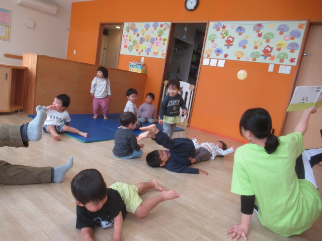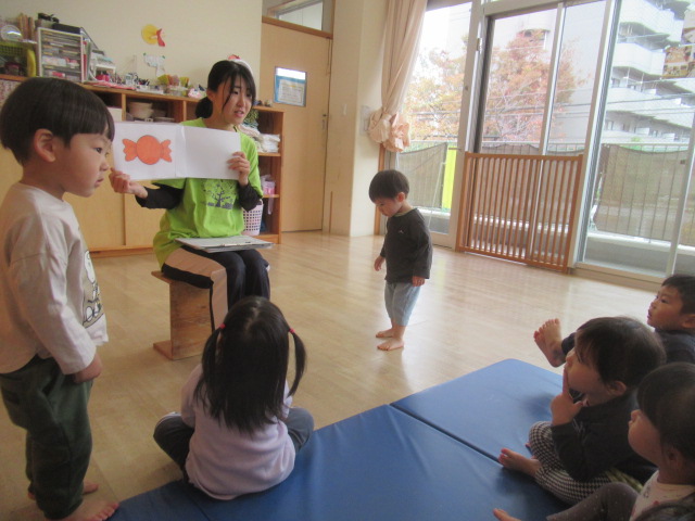 四角や丸の形が…あれあれ?紙を動かすと電車になったりキャンディになったり変身します!不思議な変化にどんぐりさんたちは釘付けになって見ていました。お名前を呼んだ後は、絵本『ぱんだのあかちゃんおっとっと』の真似っこをして遊びました。ぱんだの赤ちゃんがバランスを取りながらおっとっと!と言うフレーズが楽しくてどんぐりさんも体を斜めにしておっとっとー!とバランスを取っていましたよ。