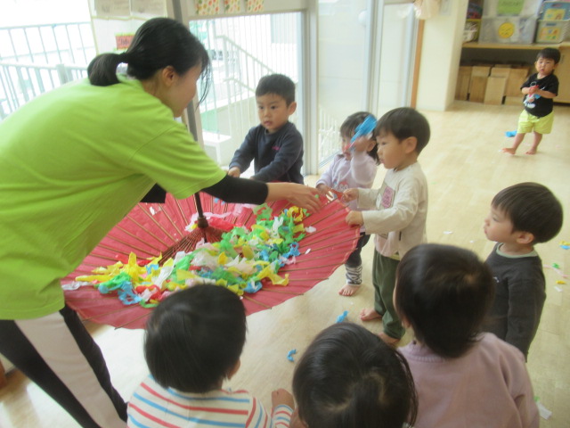 いろんな色のお花紙を丸めたりビリビリ破いたり、破った紙を散らして遊びました。傘に集めたお花紙を一気に降らせると「雨みたーい!」と大喜び!袋にお花紙を集めて目と口を付ければ…お化けの出来上がり!いろんな色だったり好きな位置に目や口を貼ったので、それぞれかわいらしいお化けが出来上がりました。お化けは持ち帰りますのでお家でも遊んでください。
