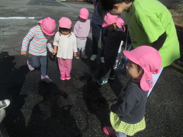 雨が上がりぶらぶら散歩に出発しました。太陽の陽が当たるところでのんびりしている猫さんを見たり、水溜まりを覗き込みながら「○○ちゃんが見える!(写ってる)」「自分が見えたよ!」と雨上がりならではの散歩を楽しみました。近くのお家の柿の色の変化も見てきたどんぐりさんは柿がオレンジに色づいていることに気付きました。これからもっともっとおいしくなるかな?おいしくなるといいねと、みんなでおいしくなる魔法をかけて帰りました。