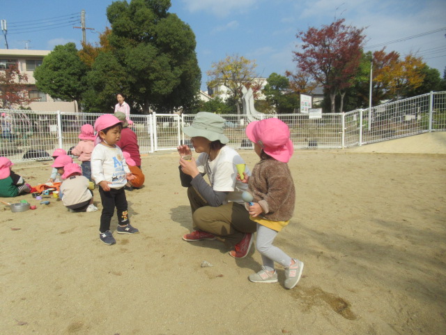 今日も公園へ行きました。途中の「おばけの道」では、大きいお友だちが「おばけがいるか見てきてあげる!」と見に行ってくれました!すると「おばけ、お買い物に行ったみたい!」と言うので、安心して通る事が出来ました。公園では、どんぐり拾いに夢中になったり、ブランコやすべり台、鉄棒などの遊具で遊んだり、砂場で砂あそびを楽しみました。