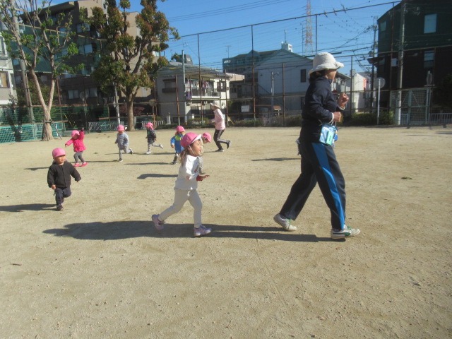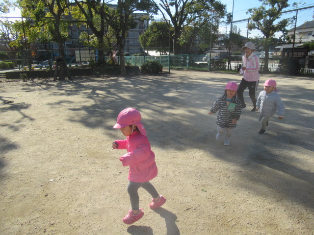 公園の広いグランドで<しっぽ取り>をして走り回り身体を暖かくしてから遊具で遊びました。ついこの前まで鉄棒にぶら下がるのもやっとだった子が足を前後に揺らして長い時間ぶら下がれたりと出来る事も増えて子どもたちの遊びも変化して来ました。帰り際、落ち葉🍂を踏んでザクザクと鳴らして見せると「(散らかっているから)そうだ、お片付けしょう!」と話ているお友だちもいましたよ。いつも子どもたちとの楽しい会話に癒されています♪