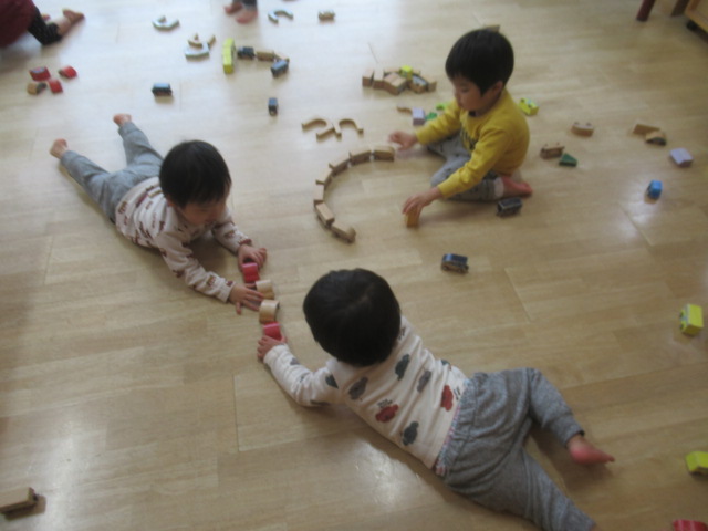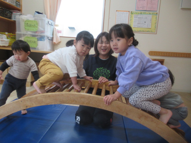 今日は部屋にすべり台やトンネル、太鼓橋を準備しサーキットをしました。保育士が見本を見せている間、じーっとマットに座って見ていたどんぐりさん。保育士が使い方を間違えると、「違う!」と首を振って教えてくれ、よく分かっています(^^)トンネルから出てくる友だちを待ち構え、「ばー!」と脅かしたり、すべり台の下に隠れている友だちや側にいる保育士に手を振ったりとめいっぱい楽しんで、体がポカポカになりました(^^)