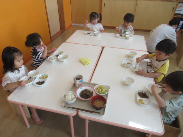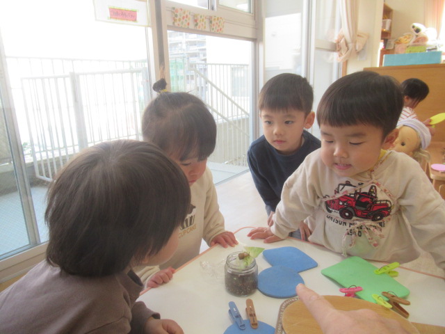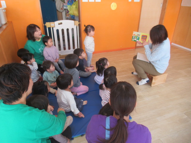 12月に入り、クリスマスの歌や、雪の歌をうたうようになりました。今日は、“雪だるまのチャチャチャ”や“あわてんぼうのサンタクロース”など、クリスマスの歌をみんなでうたいました。マラカスを鳴らしながらうたうと、何だか楽しい気分になるようです。みんなご機嫌になり、「モウ一回!」とリクエストもありました。クリスマスパーティーの絵本も見ました。