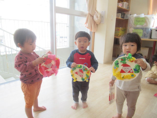サンタさんが来て貰えるように、リース作りをしました。1歳児と2歳児と内容を変えて製作しました。どちらもとっても丁寧に作り上げていて、仕上がったリースを持ち上げて大喜び!「見てみてー!」と色んな先生に報告している姿も可愛かったですよ。