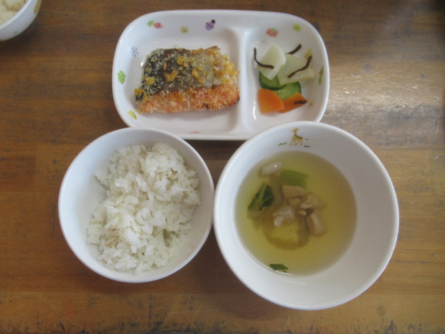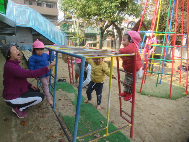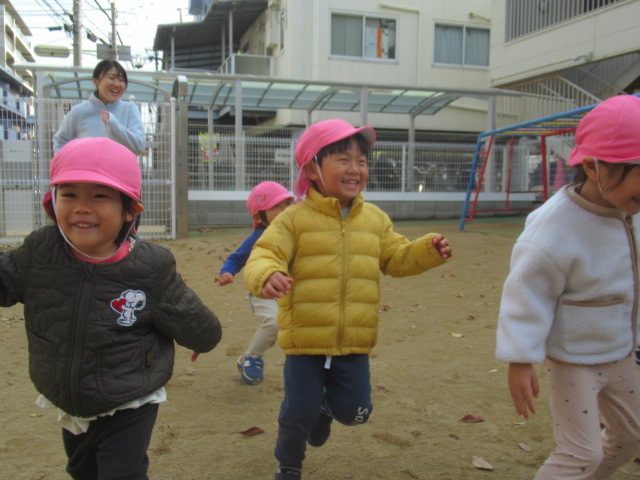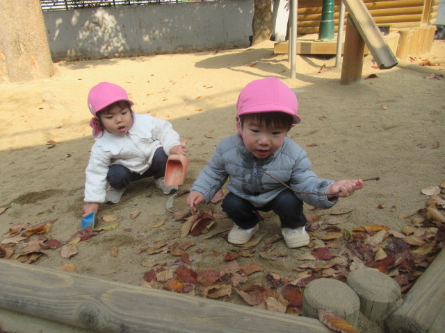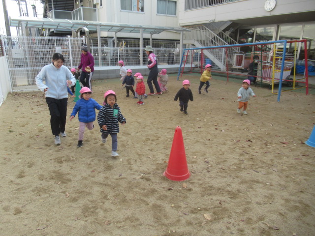 園庭に出てすぐの時は少し肌寒いかったので走って遊ぼう!とコーンをおいてスタートからゴールのコーンにタッチ!次はゴールにしていたコーンをタッチして戻ってくる!その後は、3つのコーンにタッチして戻ってくる!少しずつ難しくなりましたが、みんな走ってとまる!が楽しくて^_^何回も「もう一回!」と楽しみました^_^砂場の方では木のお家やカップにたくさんの落ち葉を詰め込んだり、木の実を使って美味しいご飯をたくさん作って楽しんでいましたよ^_^寒さに負けず、元気に戸外でもたくさん遊んでいきたいです^_^