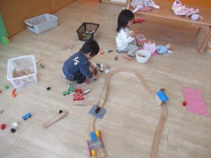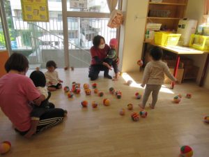 新しいお友だちは、少しずつ回数を重ねていく中で「ここがお母さんとのお別れの場所」との印象が強いと、泣き方も最初の頃よりも強くなってくる時があります。でも、それで良いのです!感情を表に出してしっかりと訴え、こちらがそれを受け止めて日々対応している内に少しずつ信頼関係が出来てきますので、今はじっくり子どもたちの涙が笑顔に変わるまで関わっていきたいと思います。今日は、ふわふわボールや、電車、ままごとで遊びましたよ。