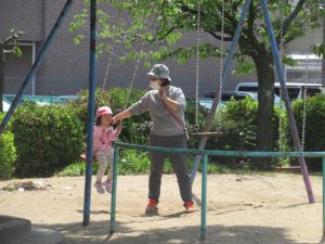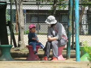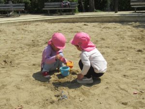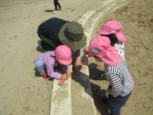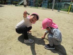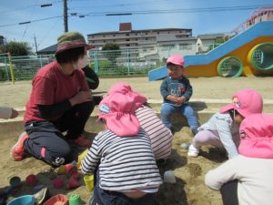 近くの公園へ行こうと出発。近くの公園なのですが、遠く感じました!新年度始まったばかりなのでゆっくり余裕をもって過ごすようにしています。公園に着くと、普段どんぐりさんに来ているお友だちに会いました。知っている顔を見つけると嬉しくてにっこりの子どもたち。遊具、お砂場で自由にのびのびあそびました。ありやちょうちょを見つけて教えてくれるお友だちがたくさんいましたよ。