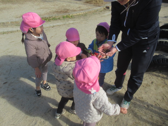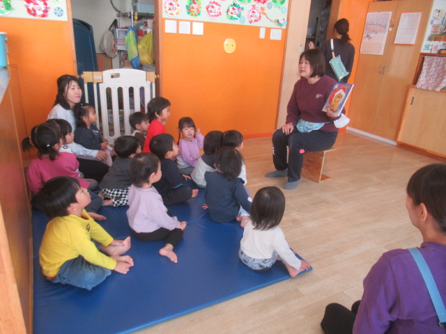 保育士が子ども用のエプロンをつけて見せると「何それ〜小さいや〜ん」と苦笑いの子どもたち。「みんなのお家の人たちは、お掃除やクリスマスにお正月のお料理を何にしましょ?って忙しくしてない?みんなも一緒にお手伝いしてあげてね」とお話しました。「わかった!」と元気にお返事が返ってきましたよ♪期待していいでしょう^_^
