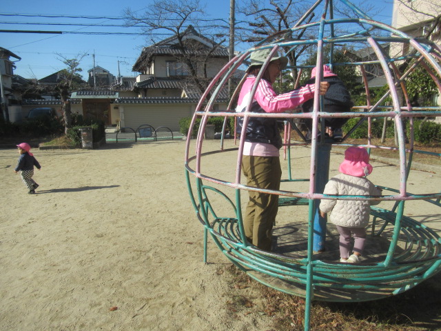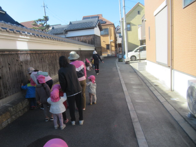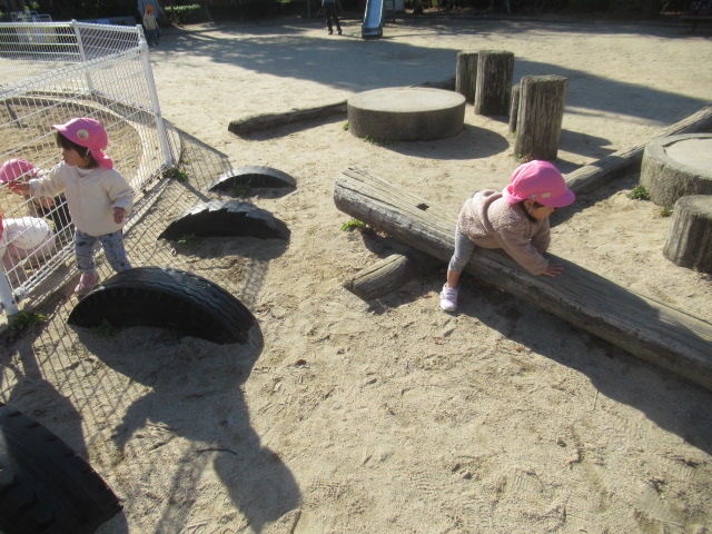 お散歩していると神社の松ぼっくりの木に2羽の小鳥がトコトコと木の上でお散歩中。それを見つけた子どもたちと松の木を見上げてしばらく観察、水路にいるタニシを見つけたりと楽しみながら公園へ。鉄棒で前回りをするお友だちを見てやってみる!と真似っこする子もいて刺激し合って遊びを楽しんでいましたよ。たっぷり遊んでの帰りは「今日の給食なんだろー?」「お魚だよ」「ヤッター」とお友だち同士の会話も楽しそうでしたよ♪
