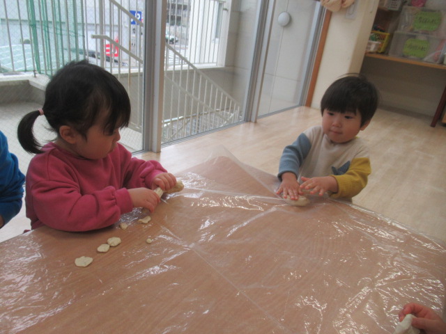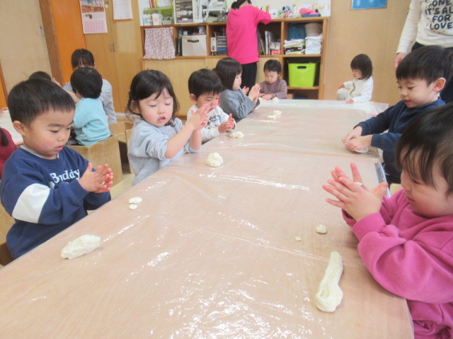 年末年始のお休みから初登園のお友だちもいましたが、周りのお友だちの様子を見ながら自分のペースで遊びに入ってきてくれました。みんな元気そうでよかったです。お友だちに会って元気がますます倍増!?朝のお集まりも賑やかな朝でした。子どもたちとお話していると、お正月にお餅を食べたお友だちもたくさんいたようなので小麦粉粘土でお餅を作ったりしようかと提案しました。