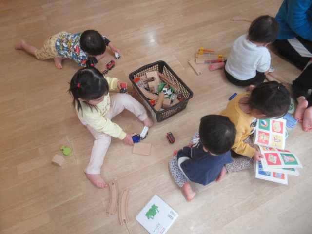 でこぼこ道の遊具を組み立てたコーナー、電車、絵本のコーナーを用意しました。好きな遊びを見つけて遊びました。
